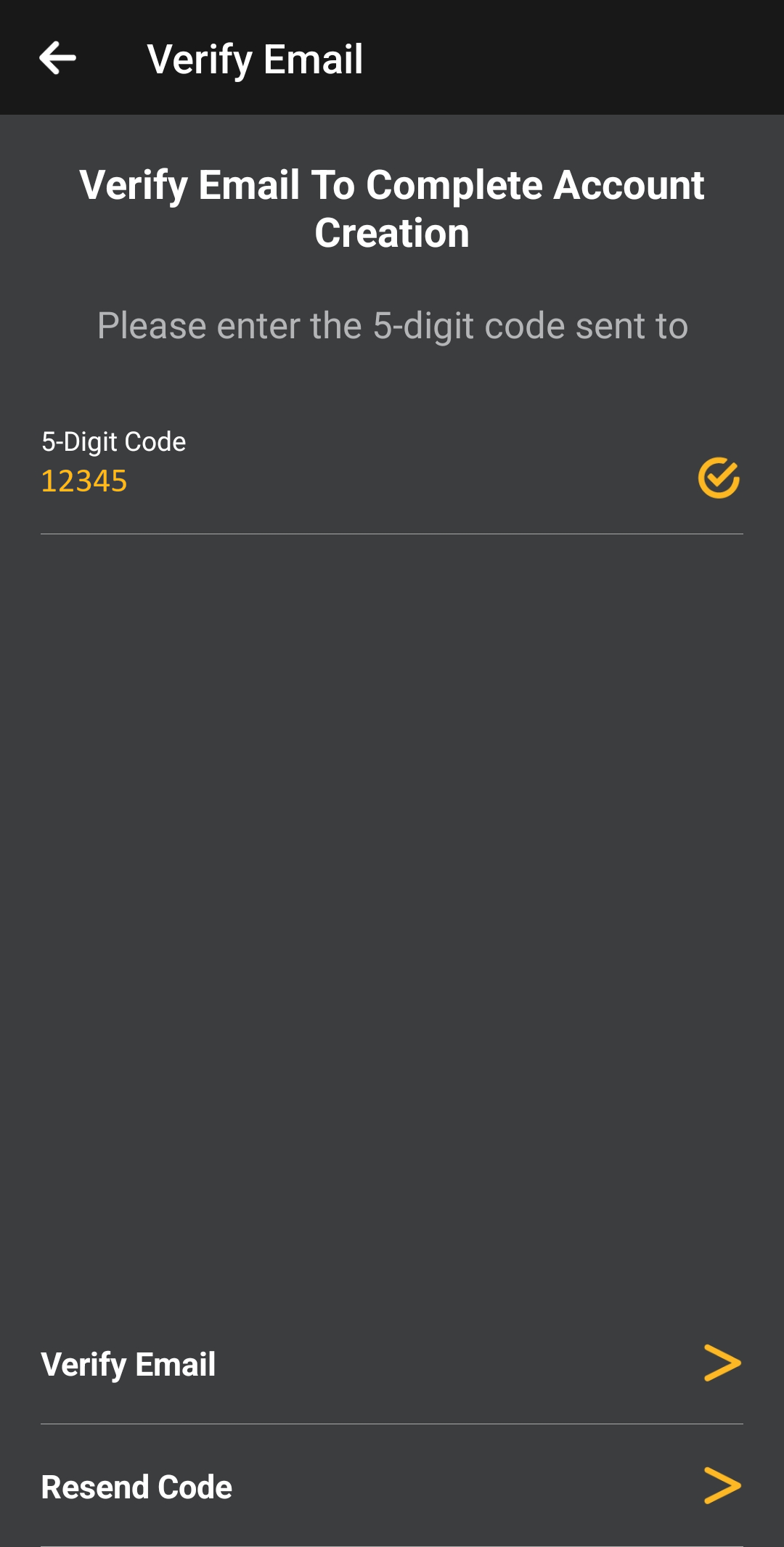 - After you tap Create Account, you will receive an email with a 5-digit code.