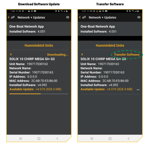 - Tap Start Transfer (Apple iOS) or Transfer (Google Android). The upload progress is displayed under the selected unit in the One-Boat Network App and in the System Status view on the fish finder.