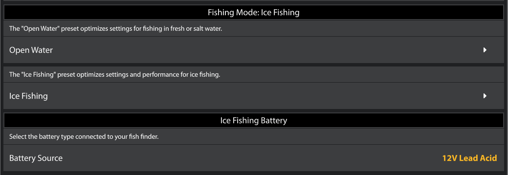 Ice and Open Water Modes have been added to the APEX series. These modes quickly set unit defaults for ice fishing or fishing from a boat. In Ice Mode, the default icons and colors, GPS location indicator (boat icon), battery/voltage, and several other items have been updated to optimize the unit for ice fishing.