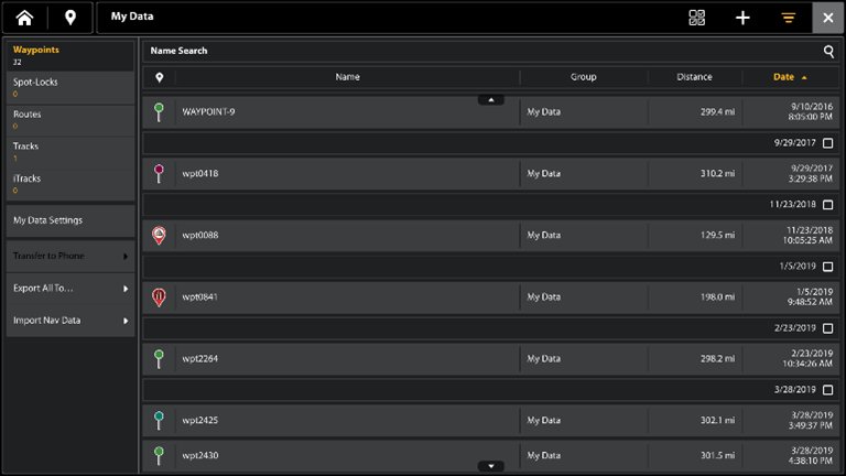 - Export or transfer specific waypoints, routes, and tracks to uniquely named GPX files on the One Boat Network App using the "select multiple" feature from the My Data tool.