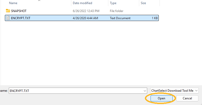 Browse to the encrypt.txt file which will be on the VX map card, select and click Open.
