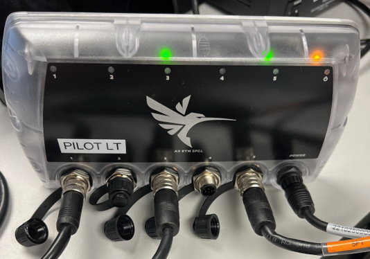 - The 5PGL has a transparent housing with LED light indicators for connection and power.
