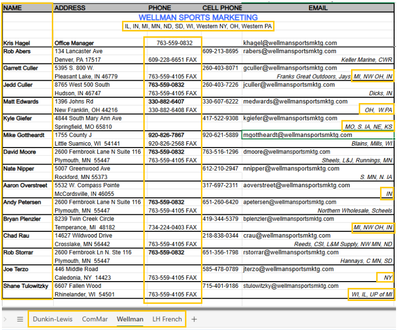 Use the Sales Rep List and Exmaple below to navigate tabs and location to provide the contact with the name and contact number for the Sales Rep for that territory. This included all Sales to Fire Departments, Law Enforcement Agencies, Universities and other agencies or departments.